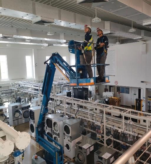 ทีมงานนำอุปกรณ์มาตรฐานไปยังสถานที่ดำเนินการซ่อมแซมหรือให้บริการ พร้อมสวมชุดยูนิฟอร์มและอุปกรณ์ Safety